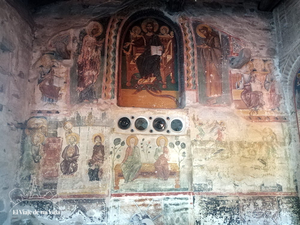 Su iglesia principal (katholikon) está dedicada a la Transfiguración de Cristo. Su tamaño es reducido (apenas caben unas 30 personas en su interior a la vez), pero cuenta con frescos del siglo XVI realmente magníficos. Está terminantemente prohibido sacar fotos en el interior de las iglesias.